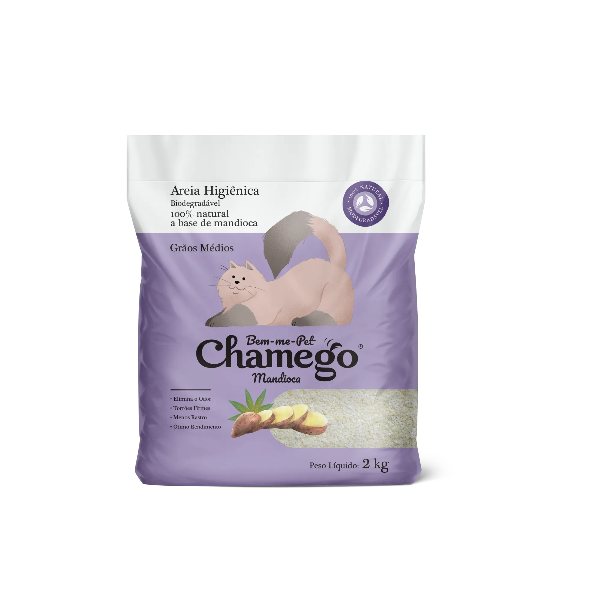 AREIA HIGIENICA DE MANDIOCA CHAMEGO 2KG GRAOS MEDIOS
